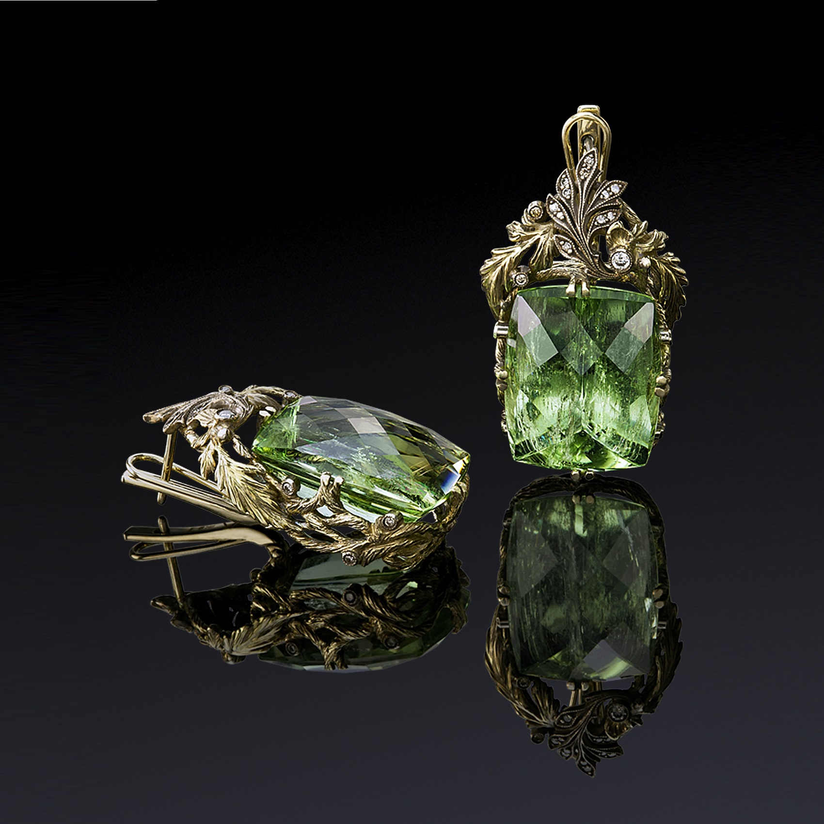 Прекрасный образец классических сережек с травянисто-зелеными бериллами, в обрамление легких изящных кастов в виде переплетенных ветвей сказочных деревьев. Резные листья наполнены бриллиантовой «росой».